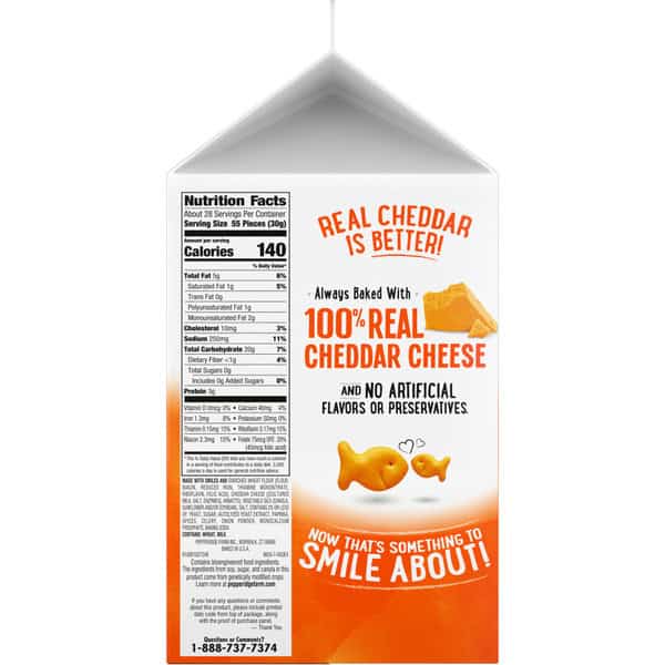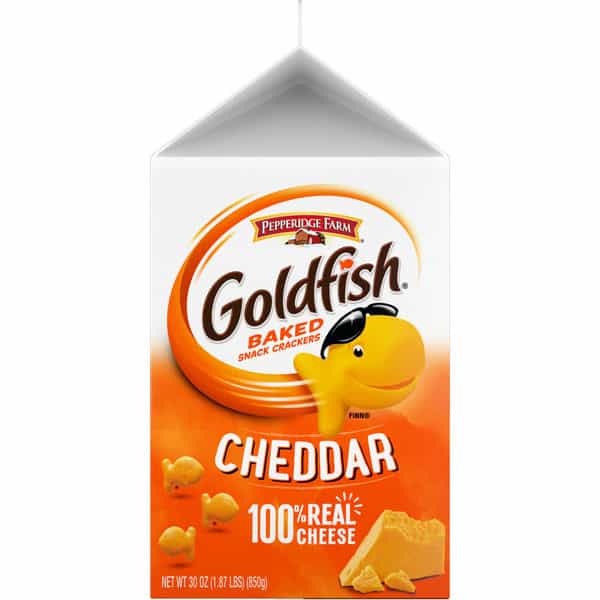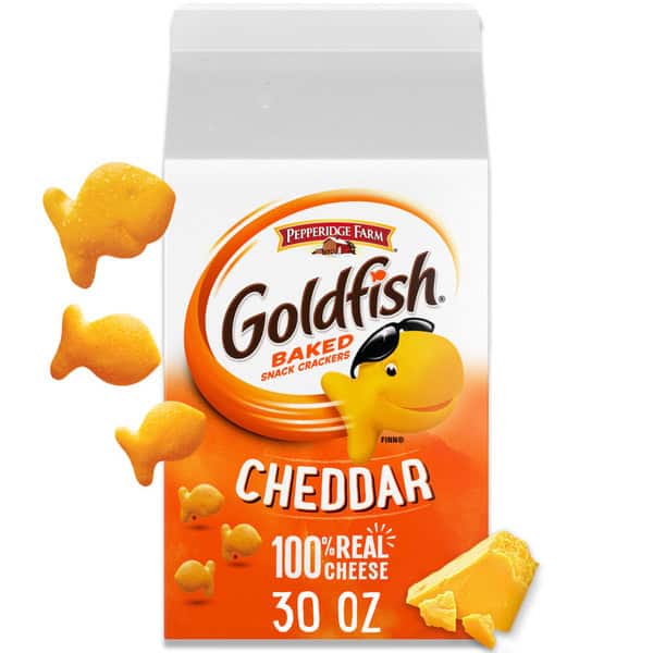 Serve up a snack the whole family will enjoy with Pepperidge Farm Goldfish Cheddar Cheese Crackers, the fun, fish-shaped snack crackers with a smile. These baked cheese snacks are made with ingredients you can feel good about, including 100% real Cheddar cheese and no artificial flavors or preservatives. The fun, bite-sized shape of Goldfish crackers make them the perfect at-home or on-the-go snacks for kids and adults. Crunchy and cheesy with an irresistible flavor, they’re a munchable must-have for school lunches, study sessions, road trips, movie nights and more. Make meals more exciting by serving Goldfish with a sandwich and fruit as part of a balanced lunch, or try them as soup crackers or salad croutons for dinner. You can even crumble them up and use them to bread chicken breasts for a cheesy twist on a classic. Each satisfying serving of 55 Goldfish Cheddar Crackers contains 140 calories and 5 grams of fat. This 30-ounce carton contains roughly 28 servings and is the ideal size for stocking your pantry. If you’re looking for even more flavor, try Goldfish Flavor Blasted snack crackers. Go for the handful with Goldfish.