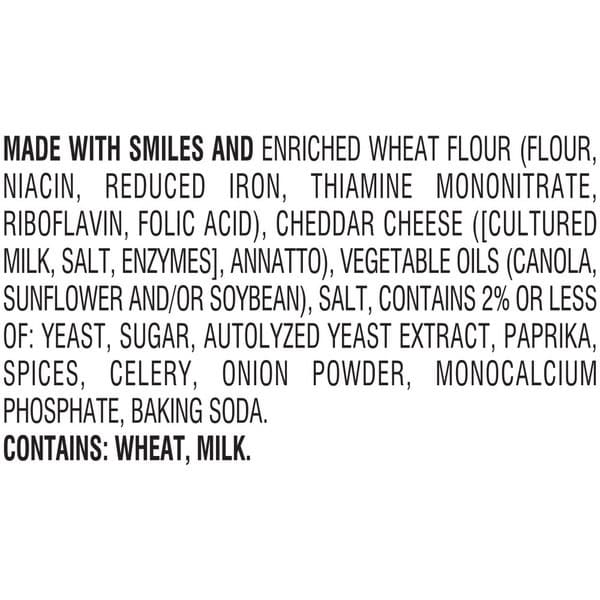 Enriched Wheat Flour (flour, Niacin, Reduced Iron, Thiamine Mononitrate, Riboflavin, Folic Acid), Cheddar Cheese ([cultured Milk, Salt, Enzymes], Annatto), Vegetable Oils (canola, Sunflower And/or Soybean), Salt, Contains 2% Or Less Of: Yeast, Sugar, Autolyzed Yeast Extract, Paprika, Spices, Celery, Onion Powder, Monocalcium Phosphate, Baking Soda