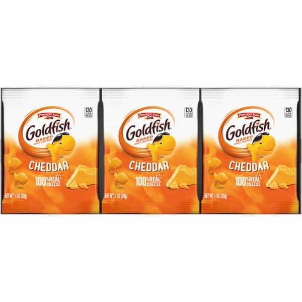 Serve up a snack the whole family will enjoy with Pepperidge Farm Goldfish Cheddar Cheese Crackers, the fun, fish-shaped snack crackers with a smile. These baked cheese snacks are made with ingredients you can feel good about, including 100% real Cheddar cheese and no artificial flavors or preservatives. The fun, bite-sized shape of Goldfish crackers make them the perfect on-the-go snacks for kids and adults. Crunchy and cheesy with an irresistible flavor, they’re a munchable must-have for school lunches, road trips, office snacks and more. Make lunchtime more exciting by serving a pack of Goldfish cheddar crackers with a sandwich and fruit, or try them as soup crackers or salad croutons. This tray contains 9 individually portioned, 1-ounce Goldfish snack packs. Each pack contains a single serving of roughly 50 crackers and has 130 calories and 4.5 grams of fat. Designed for easier on-the-go snacking, they’re the ideal size for lunchboxes, backpacks, purses and more. For even more flavor, try Goldfish Flavor Blasted crackers, also available in convenient on-the-go snack packs. Go for the handful with Goldfish.