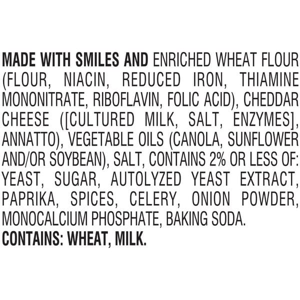 Enriched Wheat Flour (flour, Niacin, Reduced Iron, Thiamine Mononitrate, Riboflavin, Folic Acid), Cheddar Cheese ([cultured Milk, Salt, Enzymes], Annatto), Vegetable Oils (canola, Sunflower And/or Soybean), Salt, Contains 2% Or Less Of: Yeast, Sugar, Autolyzed Yeast Extract, Paprika, Spices, Celery, Onion Powder, Monocalcium Phosphate, Baking Soda