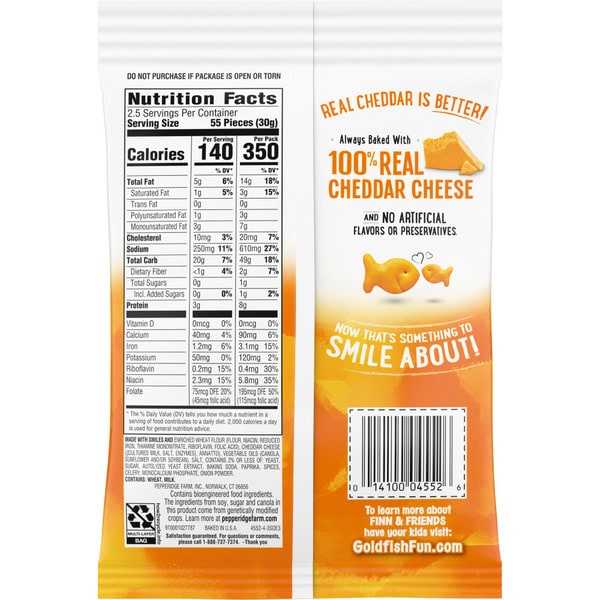 The irresistible little snack that always delights! These munchable, crunchable Goldfish Cheddar snack crackers are always baked. They’re made with 100% real Cheddar cheese with no artificial flavors or preservatives. Talk about a feel-good snack! These playful, tasty bites make snack time something to look forward to. Goldfish Cheddar snack crackers are great for lunch as well as munching. You can add them to soups or add them as a side with your sandwich. That’s all it takes to whip up a meal that’s tasty and fun! Kids and adults alike love that one-of-a-kind cheese flavor, so Goldfish Cheddar crackers are sure to be a big hit with everyone. And the handy, 2.65-oz. Snack Pack is ideal when you or anyone else in the family is on-the-go and wants something satisfying to crunch on. That means in the car, at a picnic, or in your backpack for later. When you’re craving something delicious, go for the handful!