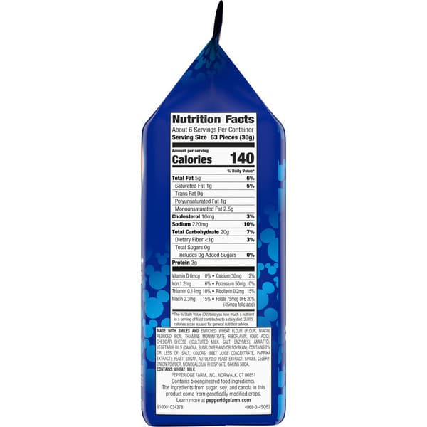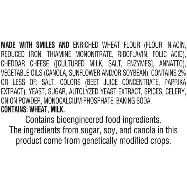 Made With Smiles And Enriched Wheat Flour (flour, Niacin, Reduced Iron, Thiamine Mononitrate, Riboflavin, Folic Acid), Cheddar Cheese ([cultured Milk, Salt, Enzymes], Annatto), Vegetable Oils (canola, Sunflower And/or Soybean), Contains 2% Or Less Of: Salt, Colors (beet Juice Concentrate, Paprika Extract), Yeast, Sugar, Autolyzed Yeast Extract, Spices, Celery, Onion Powder, Monocalcium Phosphate, Baking Soda