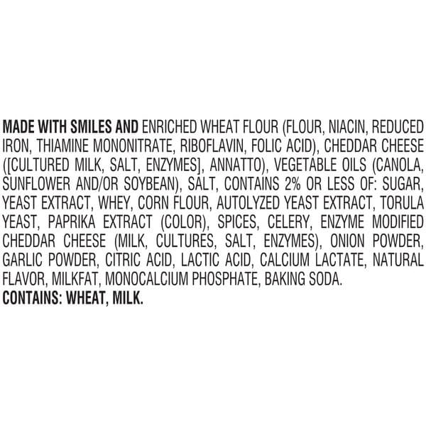 Enriched Wheat Flour (flour, Niacin, Reduced Iron, Thiamine Mononitrate, Riboflavin, Folic Acid), Cheddar Cheese ([cultured Milk, Salt, Enzymes], Annatto), Vegetable Oils (canola, Sunflower And/or Soybean), Salt, Contains 2% Or Less Of: Sugar, Yeast Extract, Whey, Corn Flour, Autolyzed Yeast Extract, Torula Yeast, Paprika Extract (color), Spices, Celery, Enzyme Modified Cheddar Cheese (milk, Cultures, Salt, Enzymes), Onion Powder, Garlic Powder, Citric Acid, Lactic Acid, Calcium Lactate, Natural Flavor, Milkfat, Monocalcium Phosphate, Baking Soda