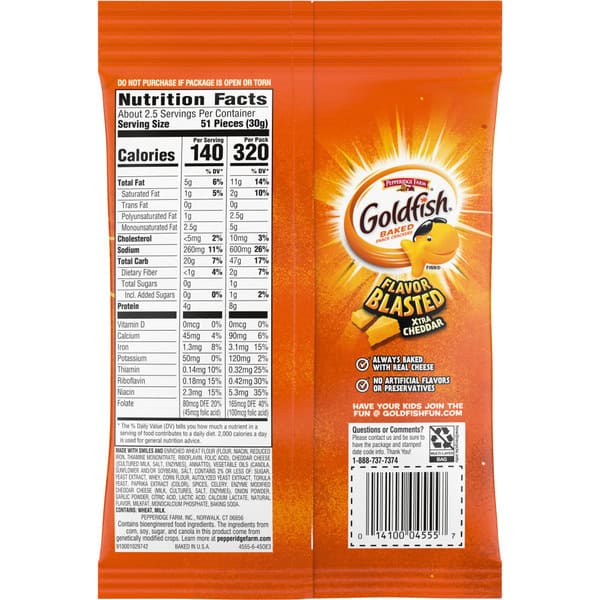 Kick snack time up a notch with the intense flavor of Goldfish Flavor Blasted Xtra Cheddar snack crackers. Everybody loves Goldfish and this flavor favorite delivers plenty of delicious. Like all Goldfish crackers, these are baked with real cheese and made with no artificial flavors or preservatives. Talk about a feel-good crunch! Grab a cheesy bag to add some fun to lunch or snack time. They also make an ideal to-go snack when you need something satisfying to nibble on. Goldfish Flavor Blasted Xtra Cheddar snack crackers will be a big hit when you’re hanging with friends at your next meet-up – so be ready to share. With intense flavor like this, these munchable, crunchable crackers keep everyone coming back for more. For your convenience, this irresistible little snack comes in a handy 2.45-oz. Snack Pack that’s ready to go when you are. When you’re craving something delicious, go for the handful!