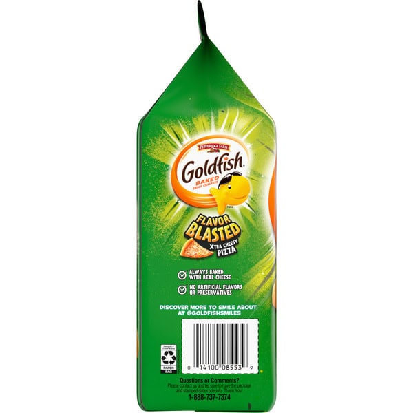 Kick snack time up a notch with the intense flavor of Goldfish Flavor Blasted Xtra Cheesy Pizza snack crackers. Like all of our cheese varieties, they’re always baked with real cheese, and are made with no artificial flavors or preservatives. So add a little fun to your snack time with this zesty and cheesy snack that’ll keep you coming back for more. They’re also the perfect companion to add a crunchy, cheesy excitement to your meals. For lunch, add them to soups, sprinkle them on salads or just simply munch them as a side with your sandwich. Crumble them up and use them to bread chicken breasts for an exciting spin on dinner. From snack time to meal time, there are so many ways to enjoy the goodness of Goldfish. And if you are looking to add a little more flavor in your life, give our Flavor Blasted Sour Cream & Cheddar, Cheddar Jack’d or Xtra Cheddar a try. Go for the handful!