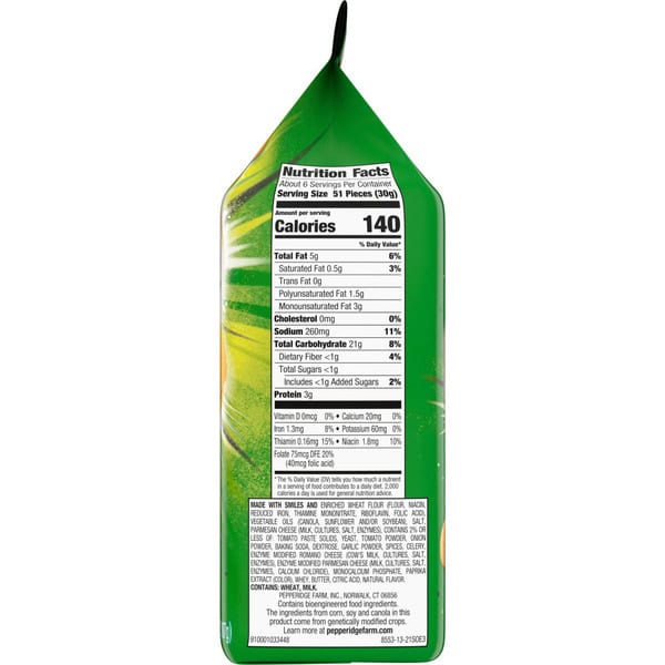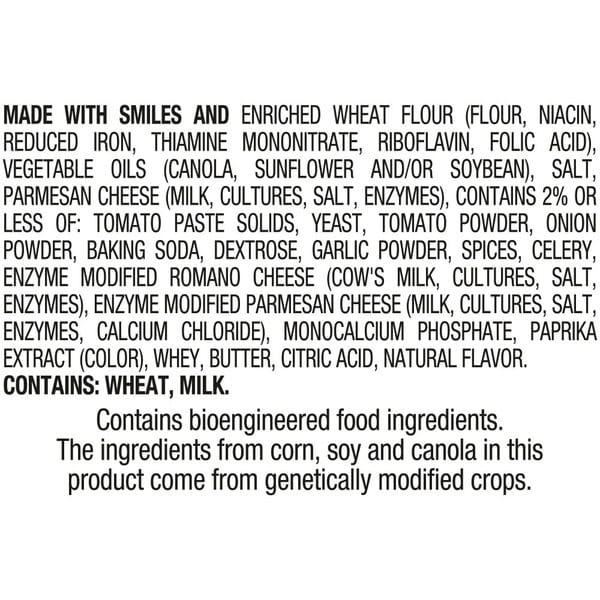 Enriched Wheat Flour (flour, Niacin, Reduced Iron, Thiamine Mononitrate, Riboflavin, Folic Acid), Vegetable Oils (canola, Sunflower And/or Soybean), Salt, Parmesan Cheese (milk, Cultures, Salt, Enzymes), Contains 2% Or Less Of: Tomato Paste Solids, Yeast, Tomato Powder, Onion Powder, Baking Soda, Dextrose, Garlic Powder, Spices, Celery, Enzyme Modified Romano Cheese (cow’s Milk, Cultures, Salt, Enzymes), Enzyme Modified Parmesan Cheese (milk, Cultures, Salt, Enzymes, Calcium Chloride), Monocalcium Phosphate, Paprika Extract (color), Whey, Butter, Citric Acid, Natural Flavor