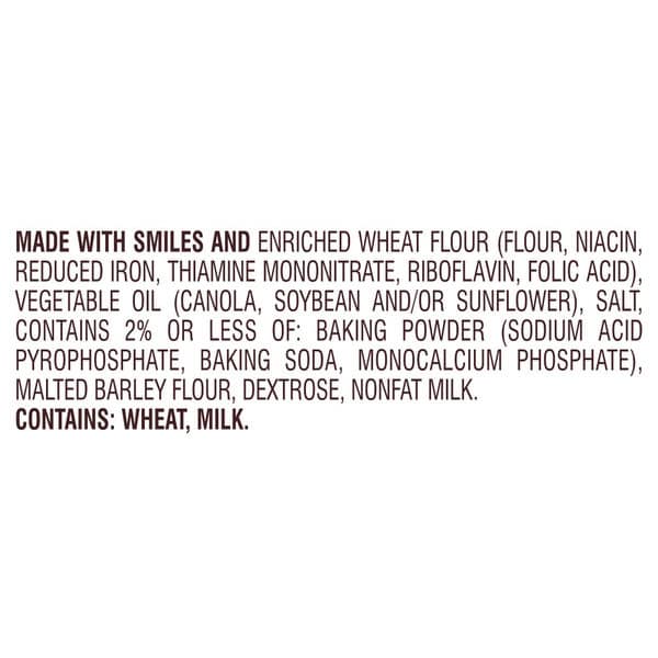 Made With Smiles And Enriched Wheat Flour (flour, Niacin, Reduced Iron, Thiamine Mononitrate, Riboflavin, Folic Acid), Canola And/or Sunflower Oils, Salt, Contains 2 Percent Or Less Of: Baking Powder (sodium Acid Pyrophosphate, Baking Soda, Cornstarch, Monocalcium Phosphate), Malted Barley Flour, Dextrose, Nonfat Milk.