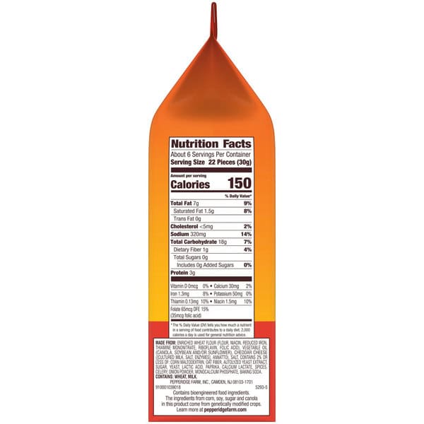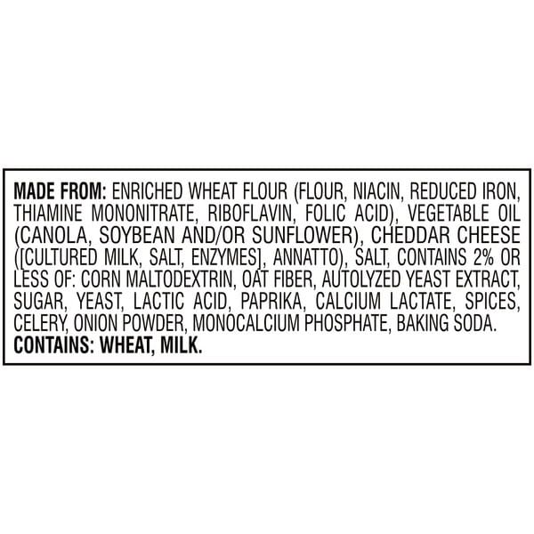 Enriched Wheat Flour (flour, Niacin, Reduced Iron, Thiamine Mononitrate, Riboflavin, Folic Acid), Vegetable Oils (canola, Sunflower And/or Soybean), Cheddar Cheese ([cultured Milk, Salt, Enzymes], Annatto), Salt, Contains 2% Or Less Of: Corn Maltodextrin, Oat Fiber, Autolyzed Yeast Extract, Sugar, Yeast, Lactic Acid, Paprika, Calcium Lactate, Spices, Celery, Onion Powder, Monocalcium Phosphate, Baking Soda