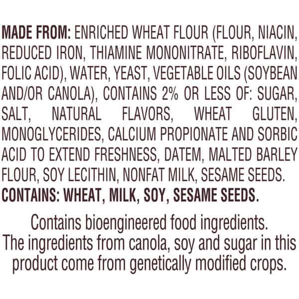 Enriched Wheat Flour (flour, Niacin, Reduced Iron, Thiamine Mononitrate, Riboflavin Folic Acid), Water, Yeast, Vegetable Oils (soybean And/or Canola), Contains 2% Or Less Of Sugar Salt, Natural Flavors, Wheat Gluten, Monoglycerides, Calcium Propionate And Sorbic Acid To Extend Freshness, Datem, Malted Barley Flour, Soy Lecithin, Nonfat Milk, Sesame Seeds