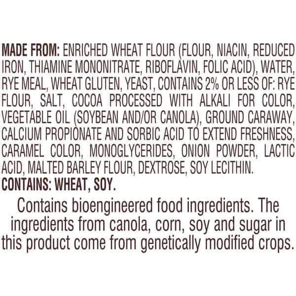 Enriched Wheat Flour (flour, Niacin, Reduced Iron, Thiamine Mononitrate, Riboflavin, Folic Acid), Water, Rye Meal, Wheat Gluten, Yeast, Contains 2% Or Less Of: Rye Flour, Salt, Cocoa Processed With Alkali For Color, Vegetable Oil (soybean And/or Canola), Ground Caraway, Calcium Propionate And Sorbic Acid To Extend Freshness, Caramel Color, Monoglycerides, Onion Powder, Lactic Acid, Malted Barley Flour, Dextrose, Soy Lecithin