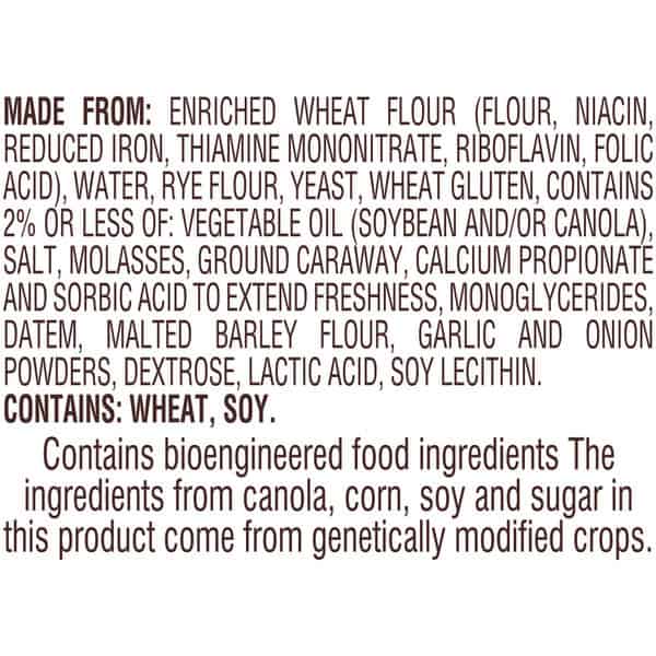 Enriched Wheat Flour (flour, Niacin Reduced Iron, Thiamine Mononitrate, Riboflavin, Folic Acid), Water, Rye Flour, Yeast, Wheat Gluten, Contains 2% Or Less Of: Vegetable Oil (soybean And/or Canola) Salt, Molasses, Ground Caraway, Calcium Propionate And Sorbic Acid To Extend Freshness, Monoglycerides Datem, Malted Barley Flour, Garlic And Onion Powders, Dextrose, Lactic Acid, Soy Lecithin.