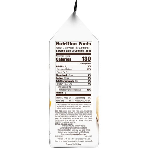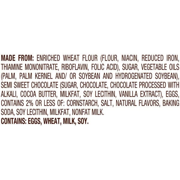 Unbleached Enriched Wheat Flour (flour, Niacin, Reduced Iron, Thiamine Mononitrate [vitamin B1], Riboflavin [vitamin B2], Folic Acid), Sugar, Vegetable Oils (palm Kernel, Palm And/or Interesterified And Hydrogenated Soybean And/or Hydrogenated Cottonseed), Semi Sweet Chocolate (sugar, Chocolate Liquor, Chocolate Liquor Processed With Alkali [dutched], Cocoa Butter, Butter Oil, Soy Lecithin, Vanilla Extract), Eggs, Contains 2 Percent Or Less Of: Cornstarch, Egg Whites, Dehydrated Skim Milk, Salt, Natural Flavors, Soy Lecithin, Milkfat And Leavening (baking Soda).