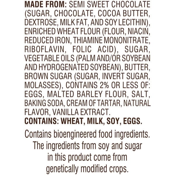 Semi Sweet Chocolate (sugar, Chocolate, Cocoa Butter, Dextrose, Milk Fat, And Soy Lecithin), Enriched Wheat Flour (flour, Niacin, Reduced Iron, Thiamine Mononitrate, Riboflavin, Folic Acid), Sugar, Vegetable Oils (palm And/or Soybean And Hydrogenated Soybean), Butter, Brown Sugar (sugar, Invert Sugar, Molasses), Contains 2% Or Less Of: Eggs, Malted Barley Flour, Salt, Baking Soda, Cream Of Tartar, Natural Flavor, Vanilla Extract