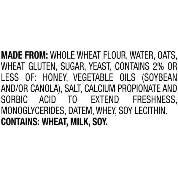 Whole Wheat Flour, Water, Oats, Wheat Gluten, Sugar, Yeast, Contains 2% Or Less Of: Honey, Vegetable Oils (soybean And/or Canola), Salt, Calcium Propionate And Sorbic Acid To Extend Freshness, Monoglycerides, Datem, Whey, Soy Lecithin