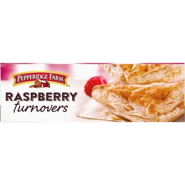 Enjoy delicious Pepperidge Farm® Turnovers made with layers of flaky puff pastry and real raspberry filling. Delicious on their own or topped with ice cream or dessert sauce. Box includes 4 frozen raspberry turnovers made with layers of flaky puff pastry and real fruit filling. Please bake in a conventional oven.