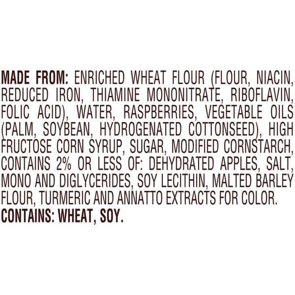 Enriched Wheat Flour (flour, Niacin, Reduced Iron, Thiamine Mononitrate, Riboflavin, Folic Acid), Water, Raspberries, Vegetable Oils (palm, Soybean, Hydrogenated Cottonseed), High Fructose Corn Syrup, Sugar, Modified Cornstarch, Contains 2% Or Less Of: Dehydrated Apples, Salt, Mono And Diglycerides, Soy Lecithin, Malted Barley Flour, Turmeric And Annatto Extracts For Color