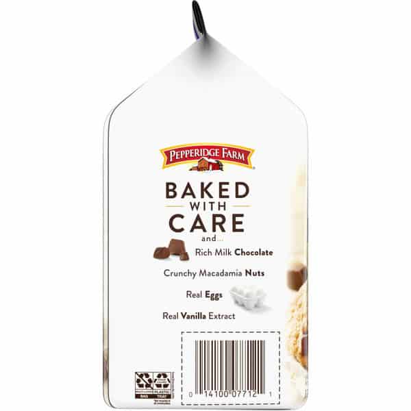 Enjoy the homemade taste of Pepperidge Farm Sausalito Crispy Milk Chocolate Macadamia Nut Cookies. Made with an abundance of rich milk chocolate chunks and crunchy macadamia nuts, these sweet and crispy cookies have a delicious melt-in-your mouth flavor. Every batch is baked with care and quality ingredients, including real eggs and real vanilla extract. Each 7.2-ounce bag contains 8 chocolate chip cookies and is perfect for sharing or stashing in your pantry to satisfy your cravings for sweet snacks. Enjoy Pepperidge Farm Sausalito Cookies on their own, dunk them in a cold glass of milk, or pair them with a hot cup of coffee. Looking for a quick and easy dessert idea for your next party? Our chocolate chunk cookies are great for serving on cookie platters and can be used to make other sweet treats such as ice cream sandwiches and sundaes. In addition to Sausalito Milk Chocolate Macadamia Nut Cookies, our line of chocolate chunk cookies also includes Tahoe White Chocolate Macadamia Nut Cookies, Chesapeake Dark Chocolate Pecan Cookies, and more. Pepperidge Farm cookies are crafted with care and quality ingredients by creative bakers who believe baking is more than a job – it’s a passion.