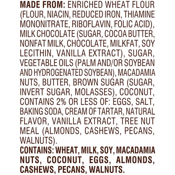 Enriched Wheat Flour (flour, Niacin, Reduced Iron, Thiamine Mononitrate, Riboflavin, Folic Acid), Milk Chocolate (sugar, Cocoa Butter, Nonfat Milk, Chocolate, Milkfat, Soy Lecithin, Vanilla Extract), Sugar, Vegetable Oils (palm And/or Soybean And Hydrogenated Soybean), Macadamia Nuts, Butter, Brown Sugar (sugar, Invert Sugar, Molasses), Coconut, Contains 2% Or Less Of: Eggs, Salt, Baking Soda, Cream Of Tartar, Natural Flavor, Vanilla Extract, Tree Nut Meal (almonds, Cashews, Pecans, Walnuts)