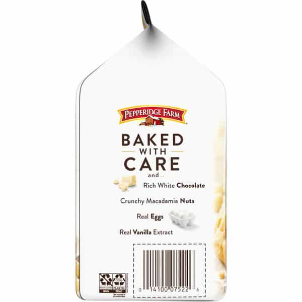 Enjoy the homemade taste of Pepperidge Farm Tahoe Crispy White Chocolate Macadamia Nut Cookies. Made with an abundance of sweet white chocolate chunks and crunchy macadamia nuts, these sweet and crispy cookies have a delicious melt-in-your mouth flavor. Every batch is baked with care and quality ingredients, including real eggs and real vanilla extract. Each 7.2-ounce bag contains 8 white chocolate chip cookies and is perfect for sharing or stashing in your pantry to satisfy your cravings for sweet snacks. Enjoy Pepperidge Farm Tahoe Cookies on their own, dunk them in a cold glass of milk, or pair them with a hot cup of coffee. Looking for a quick and easy dessert idea for your next party? Our chocolate chunk cookies are great for serving on cookie platters and can be used to make other sweet treats such as ice cream sandwiches and sundaes. In addition to Tahoe White Chocolate Macadamia Nut Cookies, our line of chocolate chunk cookies also includes Sausalito Milk Chocolate Macadamia Nut Cookies, Chesapeake Dark Chocolate Pecan Cookies, and more. Pepperidge Farm cookies are crafted with care and quality ingredients by creative bakers who believe baking is more than a job – it’s a passion.