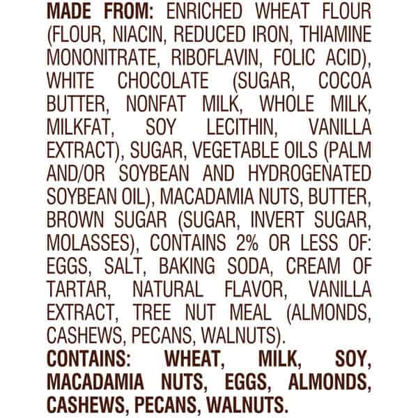 Enriched Wheat Flour (flour, Niacin, Reduced Iron, Thiamine Mononitrate, Riboflavin, Folic Acid), White Chocolate (sugar, Cocoa Butter, Nonfat Milk, Whole Milk, Milkfat, Soy Lecithin, Lecithin, Vanilla Extract), Sugar, Vegetable Oils (palm And/or Soybean And Hydrogenated Soybean Oil), Macadamia Nuts, Butter, Brown Sugar (sugar, Invert Sugar, Molasses), Contains 2% Or Less Of: Eggs, Salt, Baking Soda, Cream Of Tartar, Natural Flavor, Vanilla Extract, Tree Nut Meal (almonds, Cashews, Pecans, Walnuts)