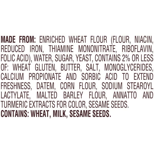 Made From: Enriched Wheat Flour (flour, Niacin, Reduced Iron, Thiamine Mononitrate, Riboflavin, Folic Acid), Water, Sugar, Yeast, Contains 2% Or Less Of: Wheat Gluten, Butter, Salt, Monoglycerides, Calcium Propionate And Sorbic Acid To Extend Freshness, Datem, Corn Flour, Sodium Stearoyl Lactylate, Malted Barley Flour, Annatto And Turmeric Extracts For Color, Sesame Seeds.