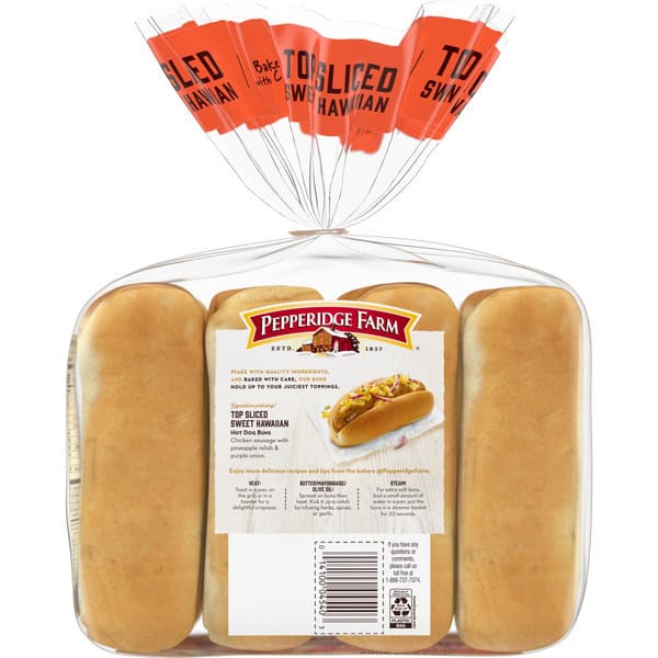 Pepperidge Farm Bakery Classics buns are baked with deliberate, thoughtful care and made with premium ingredients, perfectly orchestrated with a baker’s touch. At Pepperidge Farm, we have been baking delicious breads inspired by small-batch recipes and crafted with premium ingredients for over 80 years. For us, baking is more than a job, it’s a real passion. The whole family will love these cookout-ready, classic hot dog buns. Our Top Sliced Sweet Hawaiian buns are perfect for your favorite hot dogs, sausages, or even lobster rolls. And they stand up, making them easy to fill with your favorite toppings. Pepperidge Farm Bakery Classics stay true to the classic recipe you know and love with no colors from artificial sources and no high-fructose corn syrup. Our dedication to quality shows in the care we put into every detail. Make your meals a little more special with our 8-pack of delicious Pepperidge Farm hot dog buns.