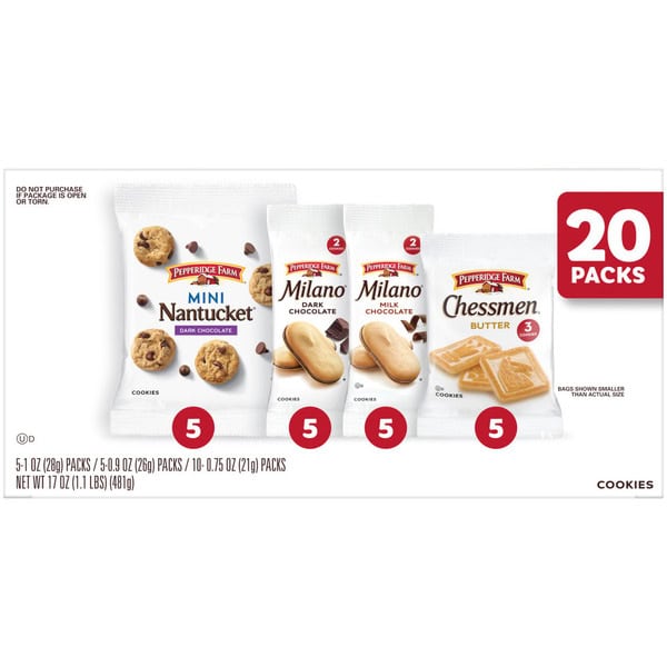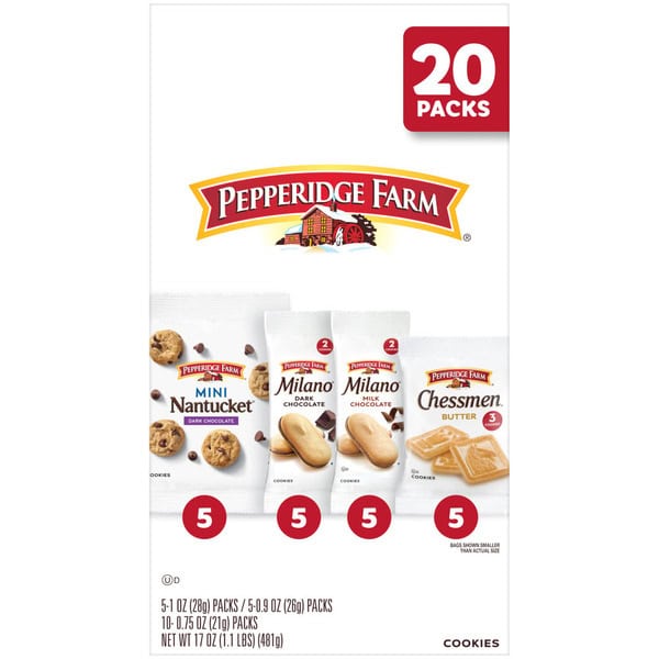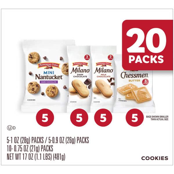 Take classic cookies on-the-go with the Pepperidge Farm Cookies Variety Pack. This 20-pack snack box includes 5 packs each of Chessmen, Mini Nantucket, Milano Milk Chocolate, and Milano Dark Chocolate cookies. Each snack pack is sized for on-the-go so it’s easy to experience a sweet treat anywhere. Have A Little Tasteâ„¢