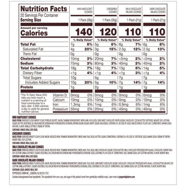 Mini Nantucket Cookies – Made From: Enriched Flour (wheat Flour, Ferrous Sulfate, Niacin, Thiamine Mononitrate, Riboflavin, Folic Acid), Semi Sweet Chocolate Drops (sugar, Chocolate, Cocoa Butter, Dextrose, Milkfat, Soy Lecithin), Sugar, Butter, Vegetable Oil (palm And/or Soybean And Hydrogenated Soybean), Brown Sugar (sugar, Invert Sugar, Molasses), Contains 2% Or Less Of: Eggs, Malted Barley Flour, Salt, Cornstarch, Baking Soda, Natural Flavor, Vanilla Extract, Cream Of Tartar.,chessmen Cookies – Made From: Enriched Wheat Flour (flour, Niacin, Reduced Iron, Thiamine Mononitrate, Riboflavin, Folic Acid), Butter, Sugar, Cornstarch, Contains 2% Or Less Of: Dextrose, Eggs, Baking Soda, Cream Of Tartar, Nonfat Milk, Soy Lecithin.,milk Chocolate Milano Cookies – Made From: Enriched Wheat Flour (flour, Niacin, Reduced Iron, Thiamine Mononitrate, Riboflavin, Folic Acid), Milk Chocolate (sugar, Cocoa Butter, Milk, Chocolate Processed With Alkali, Chocolate, Nonfat Milk, Soy Lecithin, Vanilla Extract), Sugar, Vegetable Oils (palm And/or Soybean And Hydrogenated Soybean), Eggs, Contains 2% Or Less Of: Cornstarch, Salt, Baking Soda, Soy Lecithin, Natural Flavor, Nonfat Milk.,dark Chocolate Milano Cookies – Made From: Enriched Wheat Flour (flour, Niacin, Reduced Iron, Thiamine Mononitrate, Riboflavin, Folic Acid), Semi Sweet Chocolate (sugar, Chocolate, Chocolate Processed With Alkali, Cocoa Butter, Milkfat, Soy Lecithin, Vanilla Extract), Sugar, Vegetable Oils (palm And/or Soybean And Hydrogenated Soybean), Eggs, Contains 2% Or Less Of: Cornstarch, Salt, Baking Soda, Soy Lecithin, Natural Flavor, Nonfat Milk.