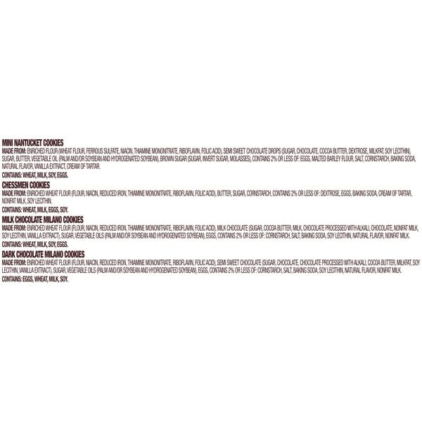 Mini nantucket cookies – contains: wheat, milk, soy, eggs., chessmen cookies – contains: wheat, milk, eggs, soy., milk chocolate milano cookies – contains: wheat, milk, soy, eggs., dark chocolate milano cookies – contains: eggs, wheat, milk, soy.