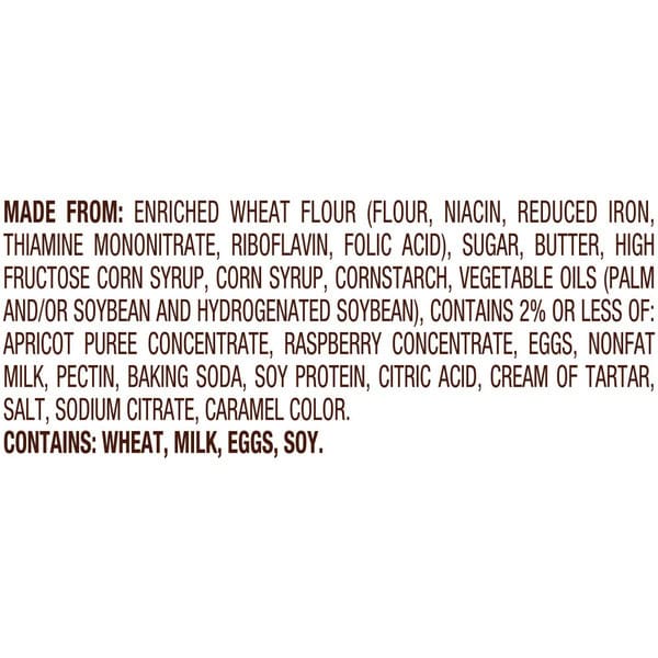 Enriched Wheat Flour (flour, Niacin, Reduced Iron, Thiamine Mononitrate, Riboflavin, Folic Acid), Sugar, Butter, High Fructose Corn Syrup, Corn Syrup, Cornstarch, Vegetable Oils (palm And/or Soybean And Hydrogenated Soybean), Contains 2% Or Less Of: Apricot Puree Concentrate, Raspberry Concentrate, Eggs, Nonfat Milk, Pectin, Baking Soda, Soy Protein, Citric Acid, Cream Of Tartar, Salt, Sodium Citrate, Caramel Color