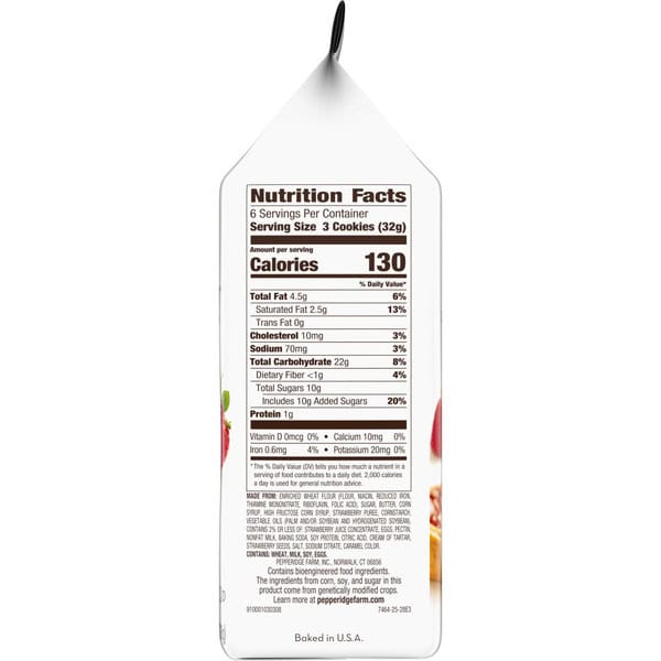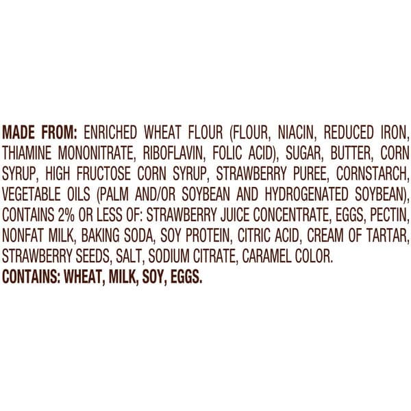 Enriched Wheat Flour (flour, Niacin, Reduced Iron, Thiamine Mononitrate, Riboflavin, Folic Acid), Sugar, Butter, Corn Syrup, High Fructose Corn Syrup, Strawberry Puree, Cornstarch, Vegetable Oils (palm And/or Soybean And Hydrogenated Soybean), Contains 2% Or Less Of: Strawberry Juice Concentrate, Eggs, Pectin, Nonfat Milk, Baking Soda, Soy Protein, Citric Acid, Cream Of Tartar, Strawberry Seeds, Salt, Sodium Citrate, Caramel Color
