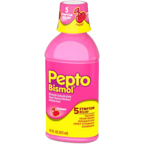Pepto Bismol Cherry Liquid. When you have a sour stomach, Pepto’s improved formula coats your stomach and provides fast relief from nausea, heartburn, indigestion, upset stomach, and diarrhea. May be HSA/ FSA eligible.