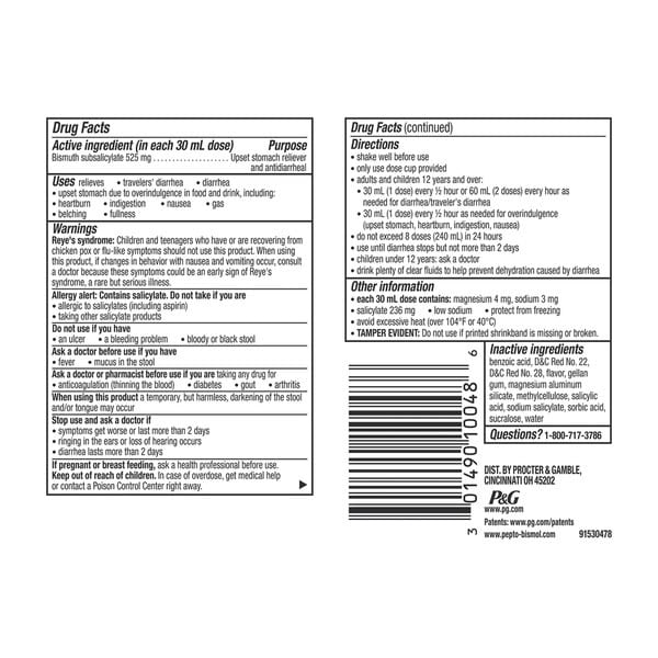 When using this product a temporary, but harmless, darkening of the stool and/or tongue may occur. Stop use and ask a doctor if symptoms get worse or last more than 2 days, ringing in the ears or loss of hearing occurs, diarrhea lasts more than 2 days. Allergy alert: contains salicylate. Do not take if you are allergic to salicylates (including aspirin), taking other salicylate products. Ask a doctor before use if you have fever, mucus in the stool. Reye’s syndrome: children and teenagers who have or are recovering from chicken pox flu-like symptoms should not use this product. When using this product, if changes in behavior with nausea and vomiting occur, consult a doctor because these symptoms could be an early sign of reye’s syndrome, a rare but serious illness. Reye’s syndrome: children and teenagers who have or are recovering from chicken pox or flu-like symptoms should not use this product. When using this product, if changes in behavior with nausea and vomiting occur, consult a doctor because these symptoms could be an early sign of reye’s syndrome, a rare but serious illness. If pregnant or breast feeding, ask a health professional before use. Keep out of reach of children. In case of overdose, get medical help or contact a poison control center right away. Do not use if you have an ulcer, a bleeding problem. Bloody or black stool. Ask a doctor or pharmacist before use if you are taking any drug for anticoagulation (thinning the blood), diabetes, gout, arthritis.