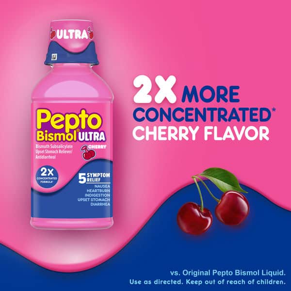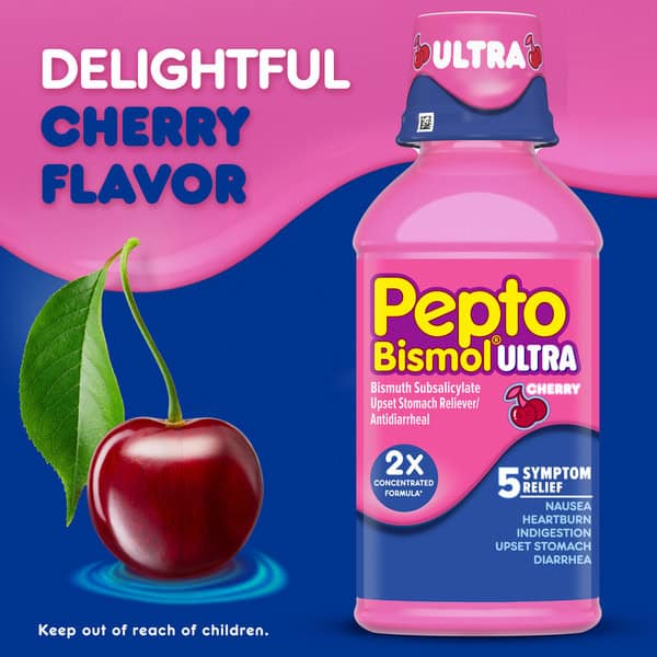Pepto Bismol Cherry Ultra Liquid. When you need upset stomach relief, Pepto coats, calms and soothes your stomach, providing fast digestive relief from nausea, heartburn, indigestion, upset stomach, and diarrhea. Pepto Bismol is formulated to coat your digestive tract to calm and soothe and provide fast and effective 5 symptom relief. Take Pepto Bismol at the first sign of digestive issues so you can get rapid relief. Don’t let stomach upsets slow you down, Pepto-Bismol’s Got Your back!Pepto Bismol provides fast relief from heartburn and indigestion, that uncomfortable feeling after you eat too much. It also provides relief from multiple stomach upsets so you can get back on track fast!Pepto Bismol has been a trusted brand for the treatment of upset stomachs for over 100 years. May be HSA/ FSA eligible, please confirm with your provider.*Pepto is the #1 Pharmacist recommended brand based on a Pharmacy Times 2022 Survey-upset stomach remedies category.