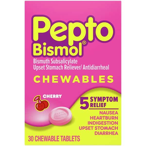 Pepto Bismol Cherry Chewable Tablets. When you have a sour stomach, Pepto’s coating action calms and soothes your symptoms, providing fast digestive relief from nausea, heartburn, indigestion, upset stomach, and diarrhea. May be HSA/ FSA eligible.