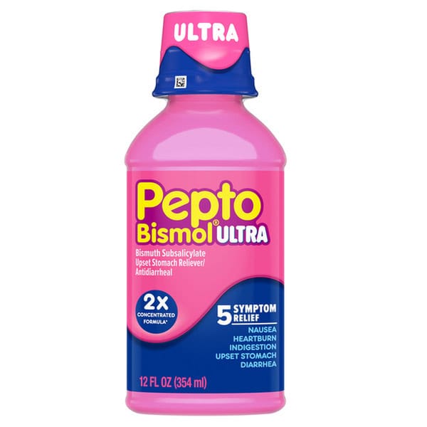 Pepto Bismol Ultra Liquid. When you need upset stomach relief, Pepto coats, calms and soothes your stomach, providing fast digestive relief from nausea, heartburn, indigestion, upset stomach, and diarrhea. Pepto Bismol is formulated to coat your digestive tract to calm and soothe and provide fast and effective 5 symptom relief. Take Pepto Bismol at the first sign of digestive issues so you can get rapid relief. Don’t let stomach upsets slow you down, Pepto-Bismol’s Got Your back! Pepto Bismol provides fast relief from heartburn and indigestion, that uncomfortable feeling after you eat too much. It also provides relief from multiple stomach upsets so you can get back on track fast!Pepto Bismol has been a trusted brand for the treatment of upset stomachs for over 100 years. May be HSA/ FSA eligible, please confirm with your provider.*Pepto is the #1 Pharmacist recommended brand based on a Pharmacy Times 2021 Survey-upset stomach remedies category.