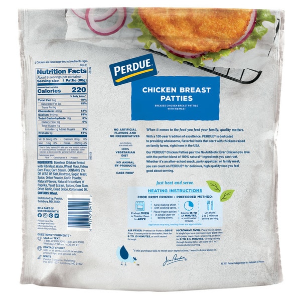 From freezer to table in minutes – PERDUE® Chicken Breast Patties are frozen and fully cooked for your convenience. Made with only white meat chicken, no fillers, and coated with a crispy, seasoned breading, they make an easy, flavorful sandwich. Simply heat what you need and store the rest for later! At PERDUE, we’re hungry for better chicken and that means paying attention to all of the details, no matter how big or small. We believe our practices – like providing healthy feed and a happy environment for our chickens – lead to better-tasting chicken. And we think you’ll agree: take one bite and taste the difference that comes from our relentless pursuit of better-tasting chicken.