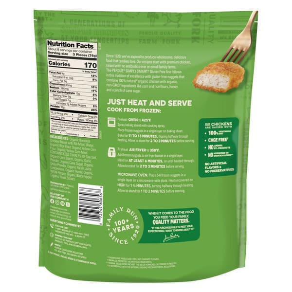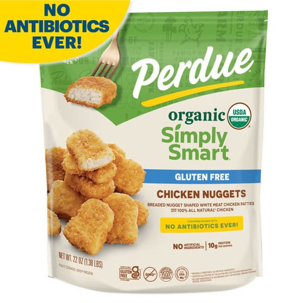 Keep it simple, smart and satisfying – PERDUE® SIMPLY SMART® Organics Gluten-Free Chicken Breast Nuggets are frozen and fully cooked for your convenience. Made with only organic, non-GMO ingredients you can recognize to create a gluten-free favorite. These nuggets are ready to dip, or to top a quick salad. Simply heat what you need and store the rest for later! At PERDUE, we’re hungry for better chicken and that means paying attention to all of the details, no matter how big or small. We believe our practices – like providing healthy feed and a happy environment for our chickens – lead to better-tasting chicken. And we think you’ll agree: take one bite and taste the difference that comes from our relentless pursuit of better-tasting chicken. *Federal regulations prohibit the use of hormones or steroids in poultry.