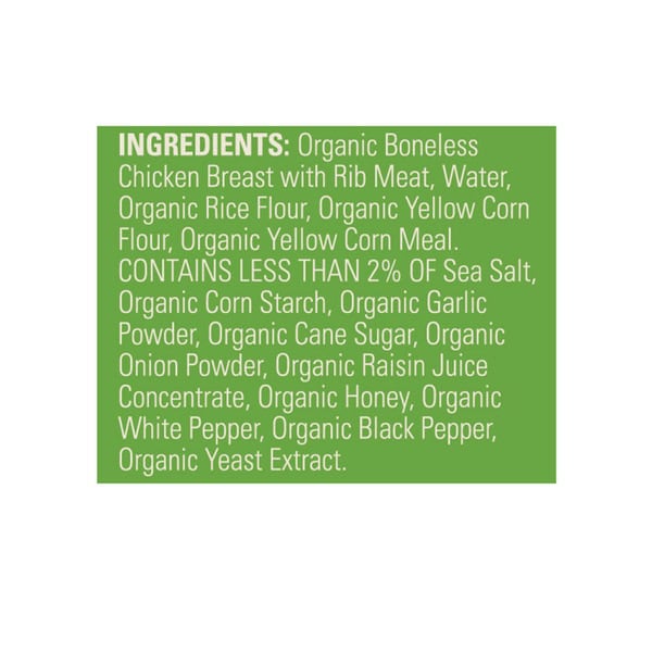 Organic Boneless Chicken Breast With Rib Meat, Water, Organic Rice Flour, Organic Yellow Corn Flour, Organic Yellow Corn Meal. Contains Less Than 2% Of Sea Salt, Organic Corn Starch, Organic Garlic Powder, Organic Cane Sugar, Organic Onion Powder, Organic Raisin Juice Concentrate, Organic Honey, Organic White Pepper, Organic Black Pepper, Organic Yeast Extract.