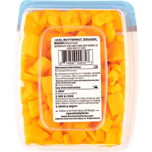 Microwave instructions: (1) Pull back film to vent. (2) Microwave on high for 4-5 minutes. Let stand for 1-3 minutes. Open tray carefully, it will be hot and the package will steam. Microwave ovens vary in power and cooking times may vary and be outside these ranges. (3) Serve and Enjoy! Easy Oven Instructions: (1) Heat: Preheat oven to 400 degrees F. (2) Mix & Cook: Toss Butternut squash with 1 tbsp. of olive oil, until evenly coated. Arrange in a single layer on a baking sheet. Bake for 18-20 minutes or until fork tender. (3) Serve & Enjoy!