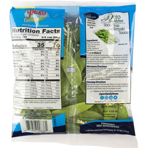 Microwave Directions: Pierce this bag with a fork. Place bag on a microwave-safe dish. Microwave on high for 3 to 5 minutes. Remove dish from the microwave. Let it stand for 1 to 3 minutes. Open bag carefully, it will be hot and the package will steam. Serve immediately and enjoy! Microwave ovens vary in power and cooking times may vary and be outside these ranges. Stovetop Directions: Remove Pero Snow Peas from bag. Bring 3 to 4 cups of water to a rolling boil. Add peas and bring water back to boiling. Cook 5 to 7 minutes or until tender. Add salt and pepper to taste.