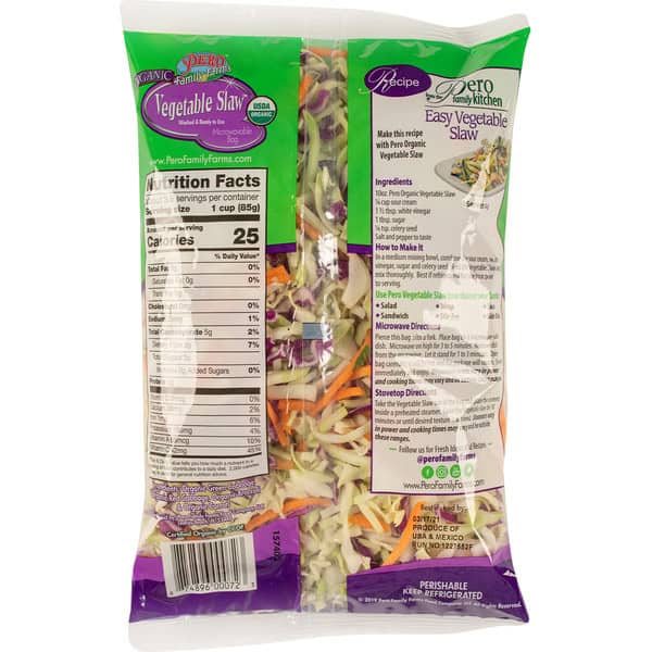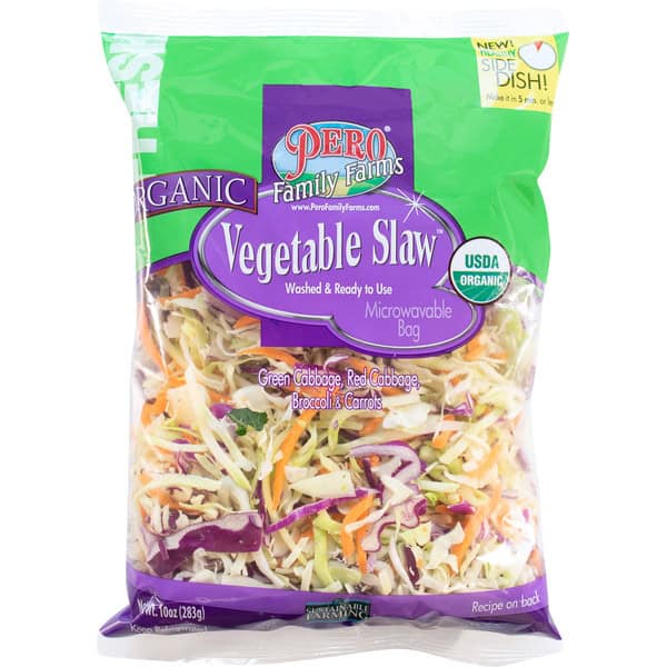 Green cabbage. red cabbage, broccoli & carrots. USDA Organic. Certified Organic by CCOF. New! Healthy side dish! Make it in 5 minutes or less. Washed & ready to use. Microwavable bag. Sustainable farming since 1908. Recipe on back. www.perofamilyfarms.com. Follow us for fresh ideas and recipes (at)perofamilyfarms. Facebook. Instagram. YouTube. Twitter. Produce of USA & Mexico.