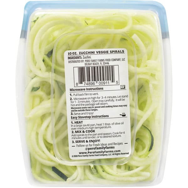 Microwave Instructions: 1. Pull back film to vent. 2. Microwave on high for 3-4 minutes. Let stand for 1-3 minutes. Open tray carefully, it will be hot and the package will steam. Microwave ovens vary in power and cooking times may vary and be outside these ranges. 3. Serve and enjoy! Easy Stovetop Instructions: 1. Heat: In a large saute pan, heat 1 tbsp. of olive oil over medium-high temperature. 2. Mix & Cook: Add spirals to the pan and season. Cook for 4 minutes until tender, or to desired texture. 3. Serve & enjoy!