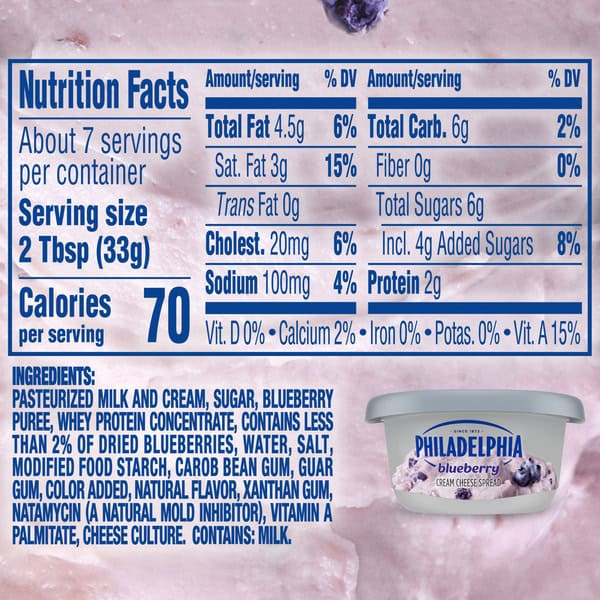 Dive into immersive pleasure with Philadelphia Blueberry Cream Cheese Spread. Made with fresh milk, real cream and blueberries for an extra creamy, multi-dimensional taste you can add to any meal. At Philly, we leave out the artificial preservatives, flavors and dyes to ensure a rich, quality flavor. Our sweet cream cheese spread is easy to spread, making it the perfect choice for adding to your morning bagel or crafting a decadent fruity dessert. Keep our 7.5 ounce resealable container of cream cheese spread refrigerated. With Philadelphia Cream Cheese Spread, enjoy a rich, creamy experience you don’t just taste, you feel.