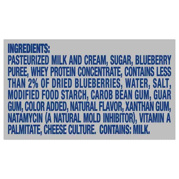 Pasteurized Milk And Cream, Sugar, Blueberry Puree, Whey Protein Concentrate, Dried Blueberries, Water, Salt, Food Starch-modified, Carob Bean Gum, Guar Gum, Color Added, Sorbic Acid (as A Preservative), Natural Flavor, Xanthan Gum, Vitamin A Palmitate, Cheese Culture