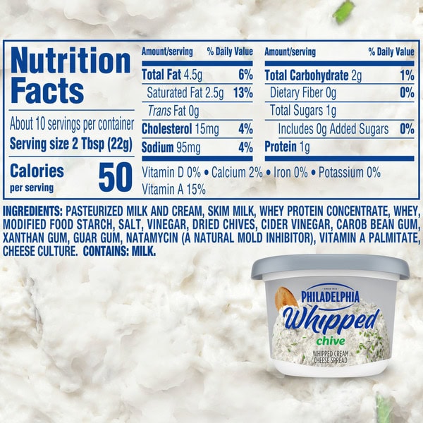 Dive into immersive pleasure with Philadelphia Chive Whipped Cream Cheese Spread. Fresh milk, real cream and chives are whipped for an extra creamy, multi-dimensional taste you can add to any meal. At Philly, we leave out the artificial preservatives, flavors and dyes to ensure a rich, quality flavor. Our light and fluffy whipped chive cream cheese spread is easy to spread, making it the perfect choice for adding to your morning bagel, dipping veggies and crackers, or elevating any breakfast sandwich. Keep our 7.5 ounce resealable container of cream cheese spread refrigerated. With Philadelphia Cream Cheese Spread, enjoy a rich, creamy experience you don’t just taste, you feel.
