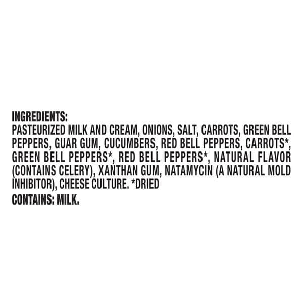 Pasteurized Milk And Cream, Whey Protein Concentrate, Whey, Onions, Salt, Carrots, Green Bell Peppers, Cucumbers, Red Bell Peppers, Green Bell Peppers*, Red Bell Peppers*, Carrots*, Carob Bean Gum, Xanthan Gum, Guar Gum, Lactic Acid, Natural Flavor (contains Celery), Sorbic Acid (as A Preservative), Vitamin A Palmitate, Cheese Culture
