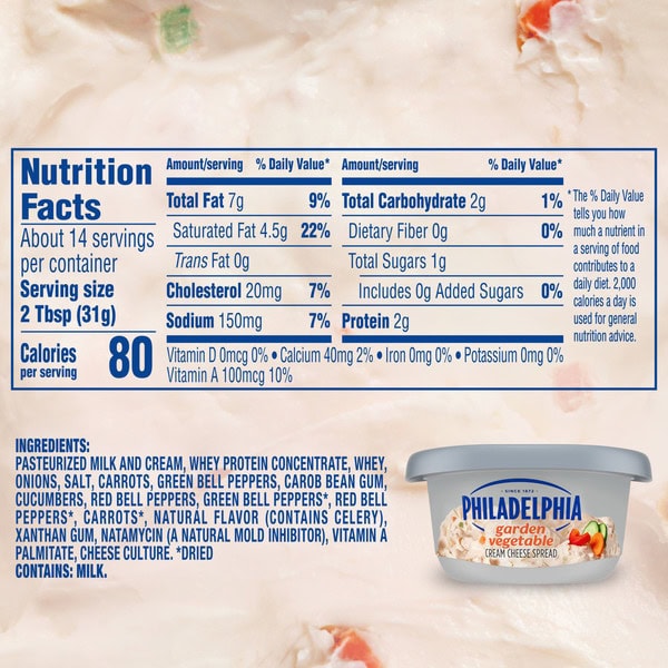 Dive into immersive pleasure with Philadelphia Garden Vegetable Cream Cheese Spread. Made with fresh milk, real cream, cucumbers, red bell peppers, green bell peppers and carrots for an extra creamy, multi-dimensional taste you can add to any meal. At Philly, we leave out the artificial preservatives, flavors and dyes to ensure a rich, quality flavor. Our garden vegetable cream cheese spread is easy to spread, making it the perfect choice for adding to your morning bagel, topping crackers or using as an ingredient in your favorite homemade dip recipe. Keep our 7.5 ounce resealable container of cream cheese spread refrigerated. With Philadelphia Cream Cheese Spread, enjoy a rich, creamy experience you don’t just taste, you feel.
