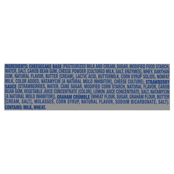 Cheesecake Base (pasteurized Milk And Cream, Sugar, Modified Food Starch, Water, Salt, Carob Bean Gum, Cheese Powder [cultured Milk, Salt, Enzymes], Whey, Xanthan Gum, Natural Flavor, Butter [cream], Lactic Acid, Buttermilk, Corn Syrup Solids, Nonfat Milk, Color Added, Natamycin [a Natural Mold Inhibitor], Cheese Culture), Strawberry Sauce (strawberries, Water, Cane Sugar, Modified Corn Starch, Natural Flavor, Carob Bean Gum, Vegetable Juice Concentrate [color], Lemon Juice Concentrate, Salt, Natamycin [a Natural Mold Inhibitor]), Graham Crumble (wheat Flour, Sugar, Graham Flour, Butter [cream, Salt], Molasses, Corn Syrup, Natural Flavor, Sodium Bicarbonate, Salt)