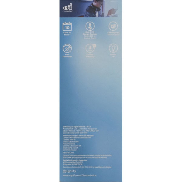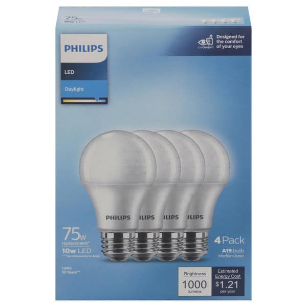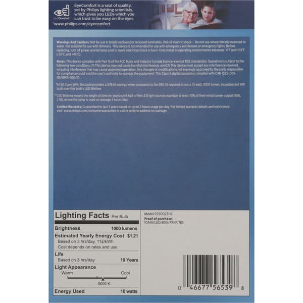 Model Number: 9290023116 Brightness Quantity: 1000 lumens. Energy Info: $1.21 based on 3 hrs/day, 11 cents/kWh. Cost depends on rates and use. 10 watts. Package Info: 4-Pack. 4. Voltage: . Bulb Info: LED. Screw. Medium. Bulb Life: 10 years based on 3 hrs/day. Bulb Appearance: 5000 k.